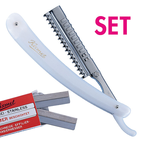 Kismet Rasiermesser mit Schutzbügel + 6 Ersatzklingen. Das Kismet Haarschneide-, Effilier- und Rasiermesser ist ein Multitalent. Mit aufgestecktem Schutzbügel haben Sie ein professionelles Effiliermesser. Wird der Schutzbügel abgezogen, ist es ein vollwertiges Rasiermesser, das besonders beliebt ist zum Ausrasieren. Mit 6 Ersatzklingen.